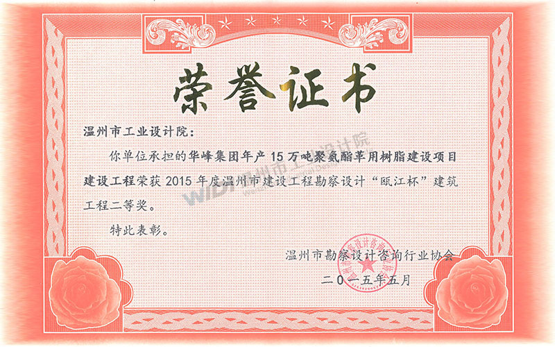 華峰集團年產(chǎn)15萬噸聚氨酯革用樹脂建設(shè)項目建設(shè)工程 甌江杯二等獎